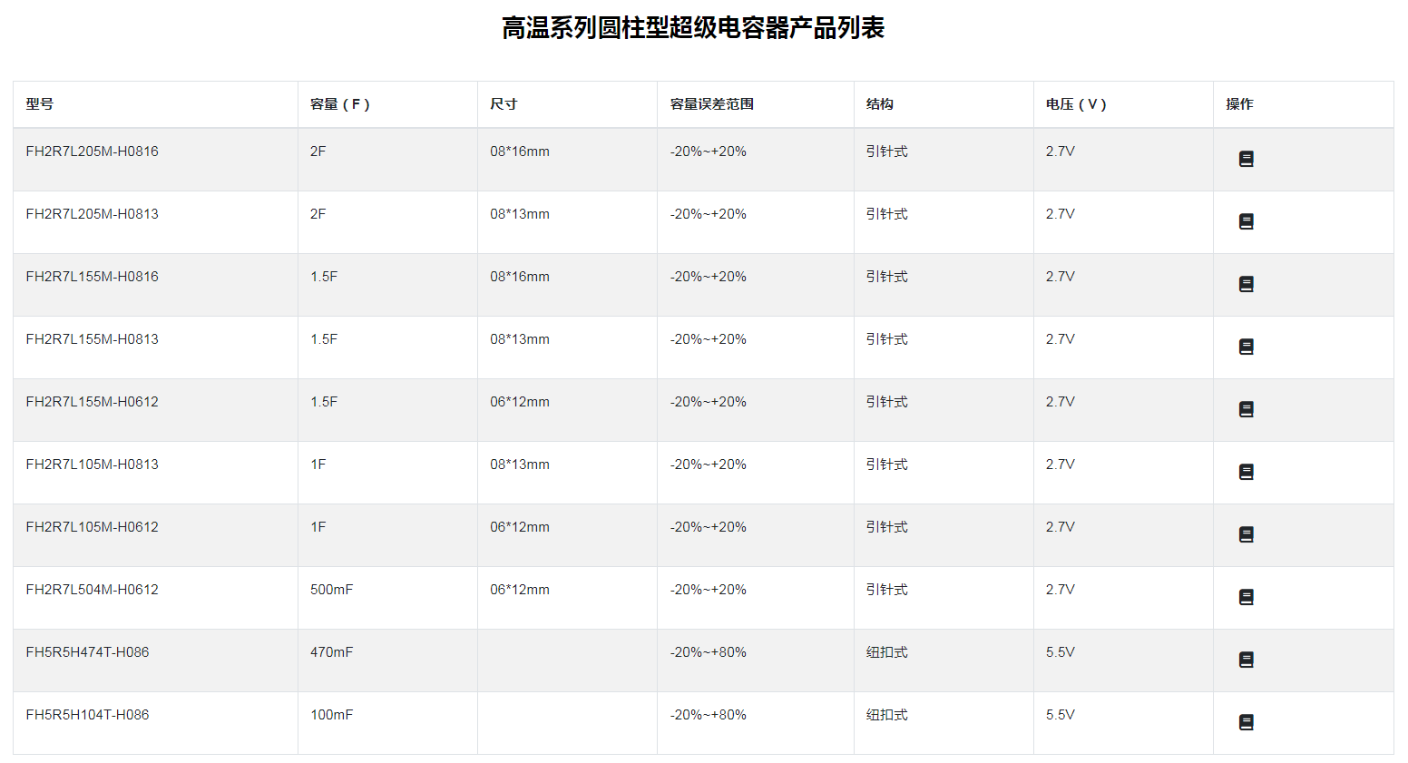■高温系列圆柱型超级电容器◆特征* 内阻低,功率密度高* 自放电率小,72 小时自放电<20%*优异的循环寿命,库仑效率达 95%以上*工作温度范围宽;*绿色环保,满足 RoHs 要求◆应用* 智能仪表、行车记录仪、照明灯具、智能家居、工业控制;* 税控收款机、数码相机、电动工具、电动玩具、备用电源;*无线节能鼠标、无线手写